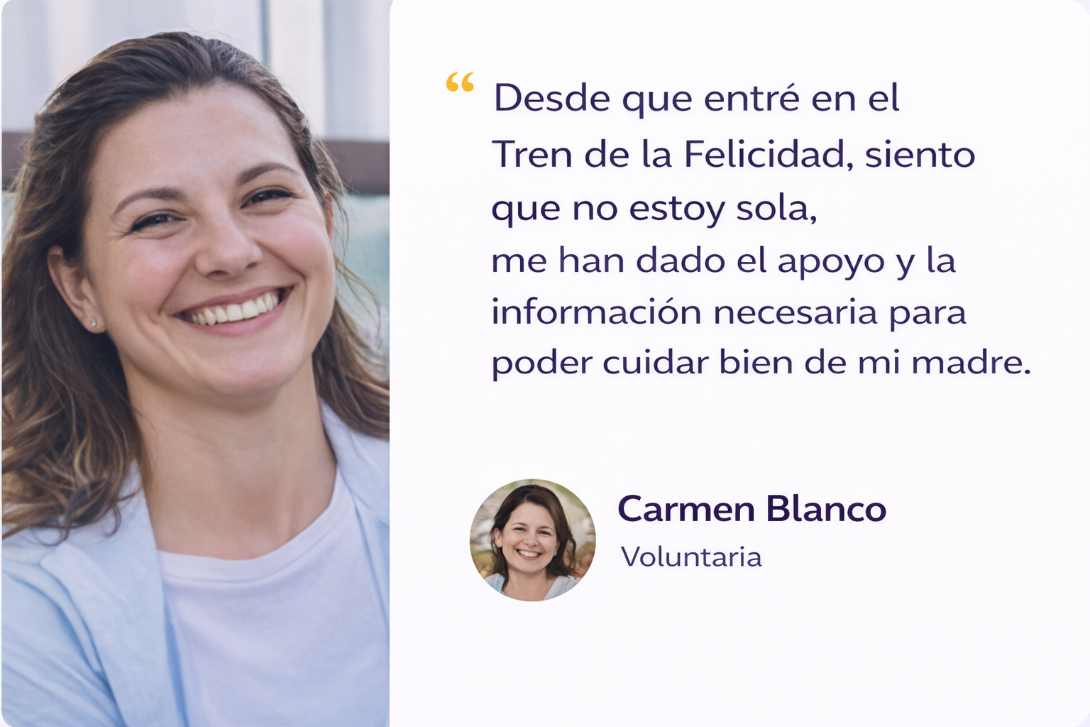 El Tren de la Felicidad de ACUFADE es la única red de apoyo integral que ofrece servicios exclusivos para las personas cuidadoras y empodera sus realidades, necesidades y derechos. Un lugar donde “no estás sola” en el cuidar. Un lugar donde “valoran y reconocen” tu dedicación. Un lugar donde “te sientes arropada” por otras cuidadoras como tú, que comprenden lo que significa atender a un familiar “las 24 horas del día, los 365 días del año”.
